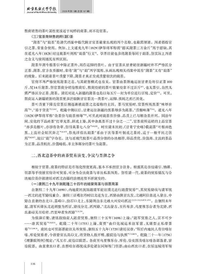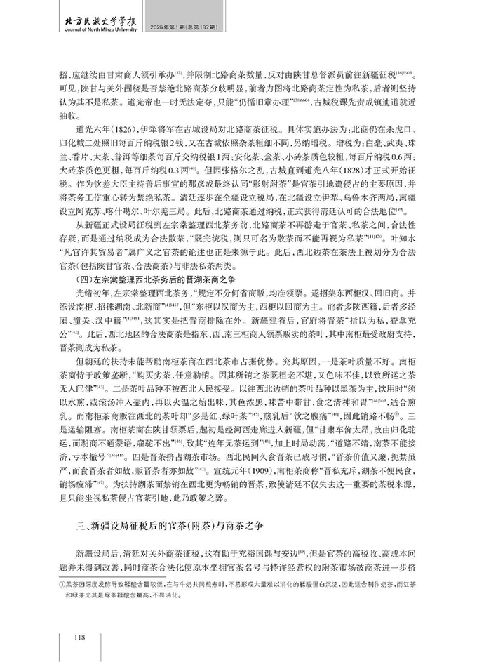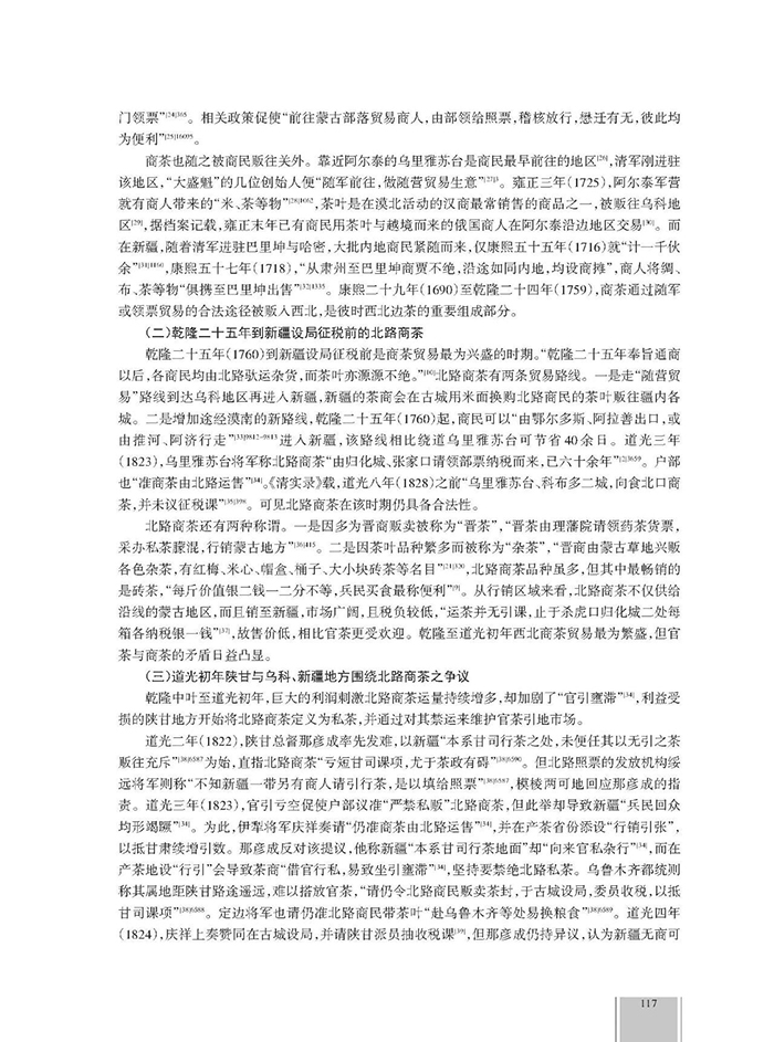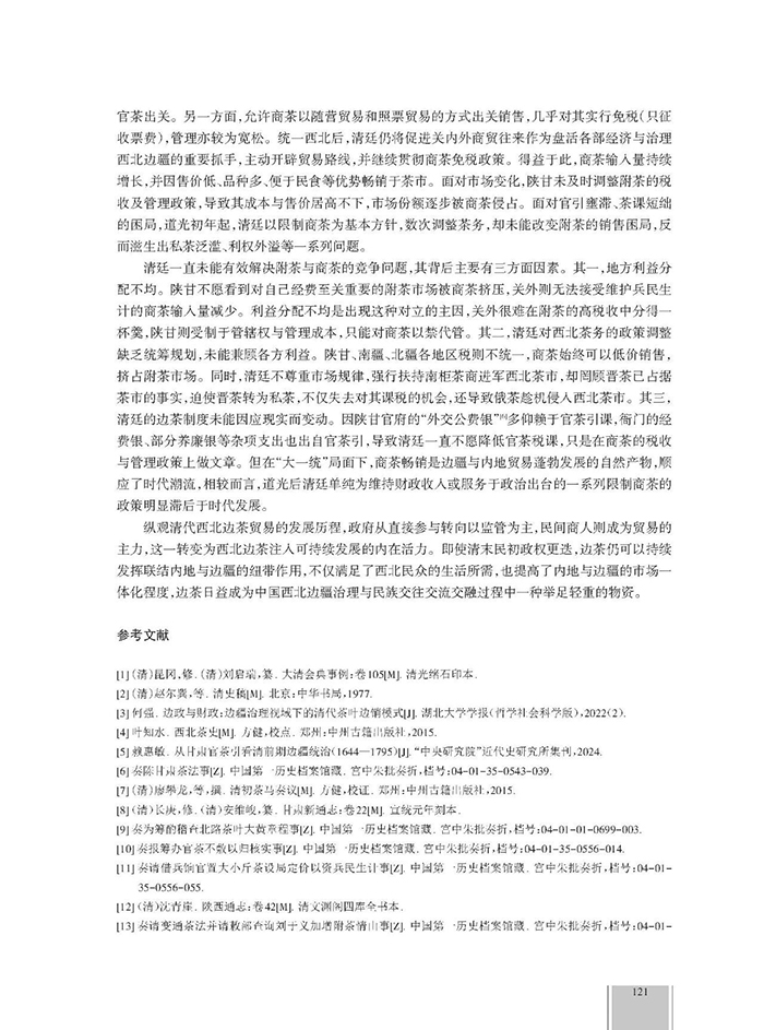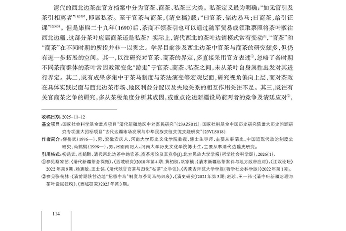 摘 要:清代西北边茶中的官茶可分为两类:一是纯粹服务于官方,不对市场销售的官茶,主要包括贮存的库茶、易马的马茶、扣饷抵价的搭饷茶;二是官方特许,由官茶商在引地销售的所谓商茶、附茶。商茶同样分两类:一是指合法商茶,康熙二十九年后,由商人以随军或领票贸易的方式贩往漠北与新疆巴里坤、哈密等地区,乾隆二十五年后增加途经漠南的路线,市场逐步拓展至新疆全境,并在新疆设局后向政府正式纳税;二是因未经请引、纳课、领票等手续而被官方认定为私茶的商茶。新疆设局后,凡经清政府许可贸易的商茶也被官方称为官茶,以区别于私茶。光绪初年,清廷调整西北茶法,晋茶又被划为私茶。官茶(附茶)与商茶之争并未随清廷设局征税或调整西北茶务结束,而是呈现出愈演愈烈之势。