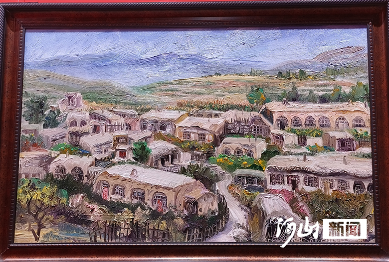 在作品《田园牧歌》中,广袤的草地间,一位牧羊人正在放牧,羊群散布在草地上,画面充满田园气息;《尽染山乡》里,远处山峦起伏,树木色彩斑斓,错落有致的房屋点缀在山坡下,悠闲的村民和劳作的场景,构成了一幅温馨的乡村画卷。《古村落》则展现了原始质朴的窑洞与远处的山丘,呈现出独特的地域风貌……在王建民的笔下,太行山的山体雄浑厚重,他运用厚重的颜料和粗犷的笔触,表现出山的肌理和质感,给人一种强烈的视觉冲击。同时,他还通过对山间村落、田野和人物的描绘,展现了太行山地区人民的生活风貌和精神世界。