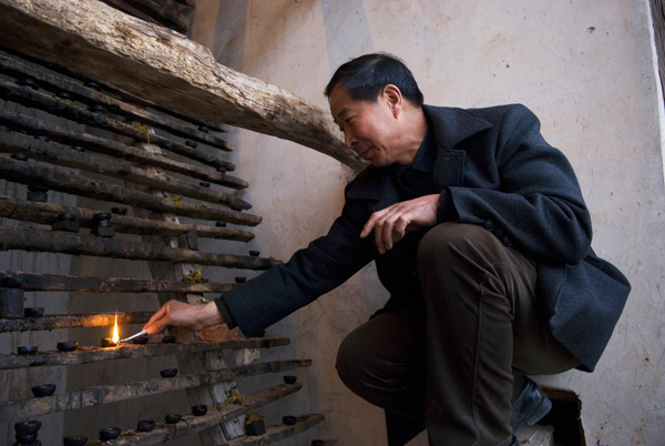 说起康春学习拜灯山技艺,那还得从上世纪七十年代说起。1970年春节期间,正在上初中的康春放假在家,每天跟着父亲康德成等拜灯山艺人看热闹。一天,当父亲和艺人们将灯山楼内的灯火字画摆好后,康春问父亲:“爹今天摆的啥字”?父亲回答:“天下太平”。康春说:“错啦!”父亲和另两个艺人说:“没错!”康春仍坚持:“错啦!”父亲不高兴地说:“去,你懂啥!”拜灯山的灯火字画在未点燃之前,是难以看出图形的。康春见说不服父亲他们,便小声嘟哝一句:“点着火你就知道啦!”生气的扭身走了。当夜幕降临,灯山点燃时,果然灯火字画的“天下太平”的“太”字少了一点,成了“天下大平”。康春父亲一见说:“坏了!还真让这小子说中了。”连忙招呼艺人们加灯盏补上“太”字那一点。艺人们赞许地对康春父亲说:“老康,你儿子行,咱拜灯山后继有人了!”从此,父亲再也不敢小瞧康春,每逢村里拜灯山民俗活动,只要康春在家,父亲总要带他去,让他认真学习拜灯山技艺。