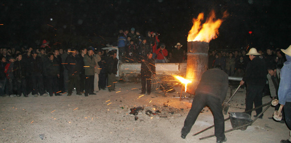 打树花的技术传承到现在是第八代了,其代表性传承人是薛建国。薛建国,男,铸造工,河北省蔚县暖泉镇北官堡村人。1972年出生,12岁跟父亲学艺,18岁初中毕业后在本镇自家创办的铸造厂里跟随爷爷和父亲干起了铸造行业。