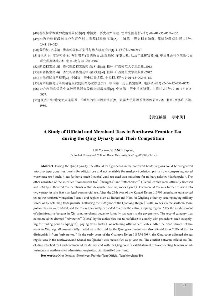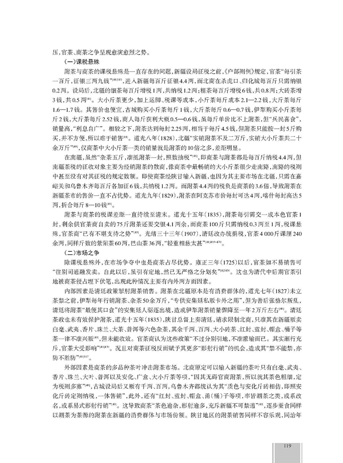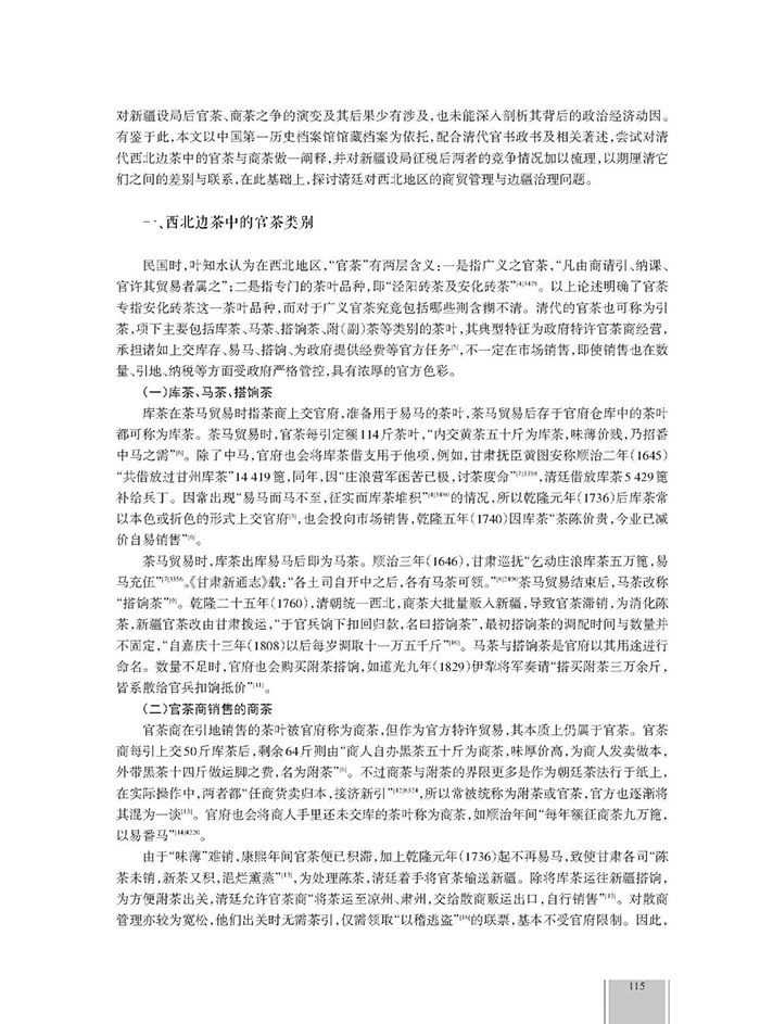 摘 要:清代西北边茶中的官茶可分为两类:一是纯粹服务于官方,不对市场销售的官茶,主要包括贮存的库茶、易马的马茶、扣饷抵价的搭饷茶;二是官方特许,由官茶商在引地销售的所谓商茶、附茶。商茶同样分两类:一是指合法商茶,康熙二十九年后,由商人以随军或领票贸易的方式贩往漠北与新疆巴里坤、哈密等地区,乾隆二十五年后增加途经漠南的路线,市场逐步拓展至新疆全境,并在新疆设局后向政府正式纳税;二是因未经请引、纳课、领票等手续而被官方认定为私茶的商茶。新疆设局后,凡经清政府许可贸易的商茶也被官方称为官茶,以区别于私茶。光绪初年,清廷调整西北茶法,晋茶又被划为私茶。官茶(附茶)与商茶之争并未随清廷设局征税或调整西北茶务结束,而是呈现出愈演愈烈之势。