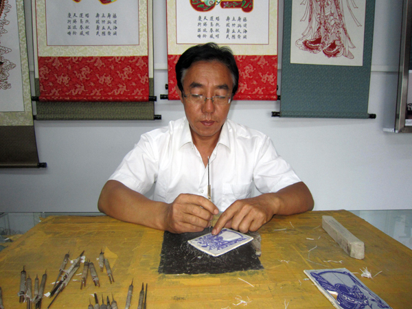 周志旺,1960年出生于蔚县的剪纸之乡南张庄村。父亲周孝是王老赏的正宗传人。周孝家与王老赏家斜对门居住,周孝常跑到王老赏院中玩耍,每年中秋、腊月还和王老赏父子索要窗花,并装饰在窗户上,慢慢地他也萌发了学习窗花技艺的念头。此时王老赏年已过半百,怕带不好徒弟,就让周孝拜其子王守业为师。王守业首先给他打了几把刀子,有了刀子,周孝在王老赏父子的指导下开始了学刻窗花。半年之后,王老赏看到他刻得货很好,就教他配色,染窗花。又过了半年,周孝刻染全面掌握了,王老赏就让他跟着儿子到县城撑亮子卖货,没想到周孝亮子前买窗花的人头攒动,不亚于王守业。周孝对王老赏父子既尊敬又崇拜,潜心向他们学习剪纸技艺,以提升自己的技能,成为剪纸行业的佼佼者,至今周志旺家还保存着王老赏的戏人剪纸珍品。